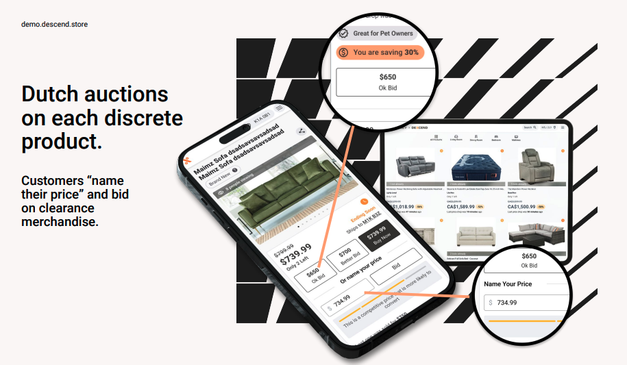 And this holds consumers’ attention. Unlike traditional furniture pricing models — whose one-way nature can instantly lose people — the gamified format of Dutch auctions resolves clearance’s consumer-retailer stalemate. With pricing now up for negotiation, consumers are much higher-intent.